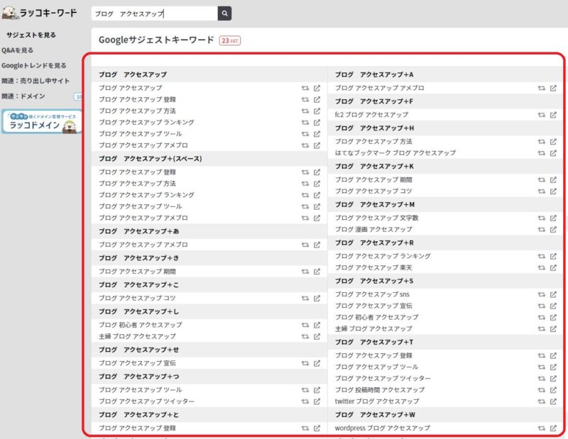 例えば「ラッコキーワード」で「ブログ アクセスアップ」を検索してみます。