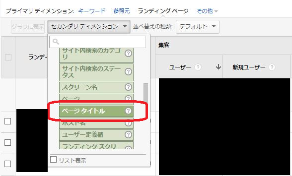 - 「セカンダリ ディメンション」>「行動」>「ページタイトル」をクリックする