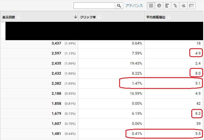 - クリック数の多い順に並んでいるのを「表示回数」をクリックして、表示回数の多い順に並び替える